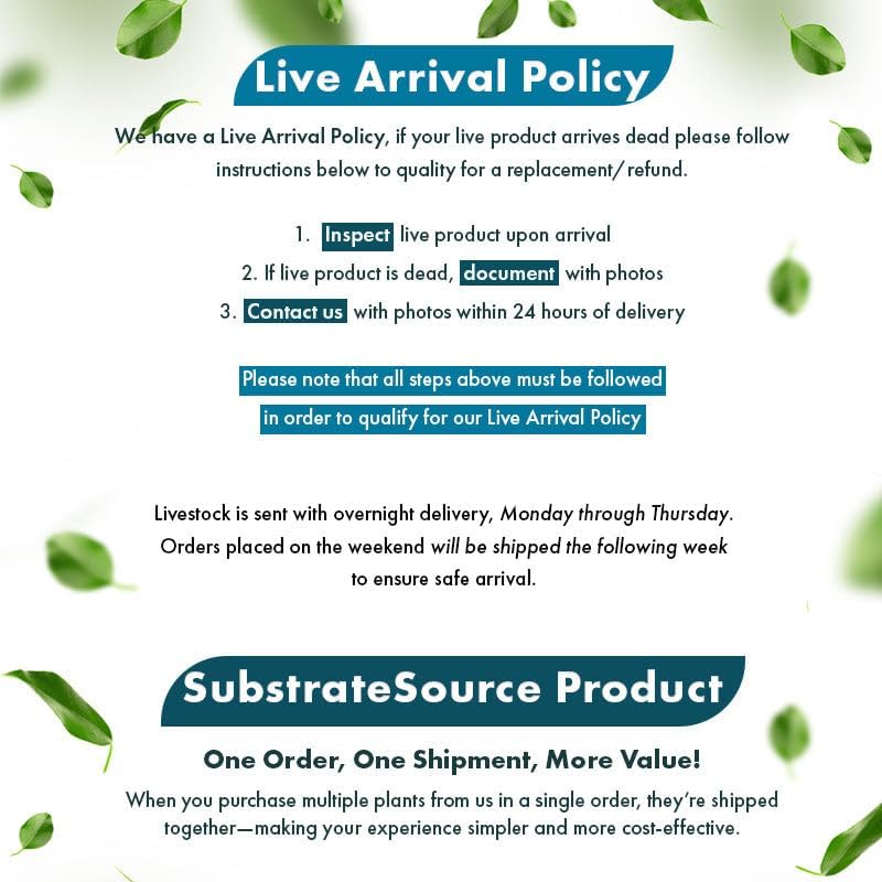 • SubstrateSource inspects each plant prior to shipping and ships all plants in healthy, stable condition with proper packing materials to ensure its safe arrival during shipping. Each plant is backed with a 100% dead-on-arrival replacement guarantee. To qualify, customers must provide a photo of the DOA plant within 24 hours of delivery.