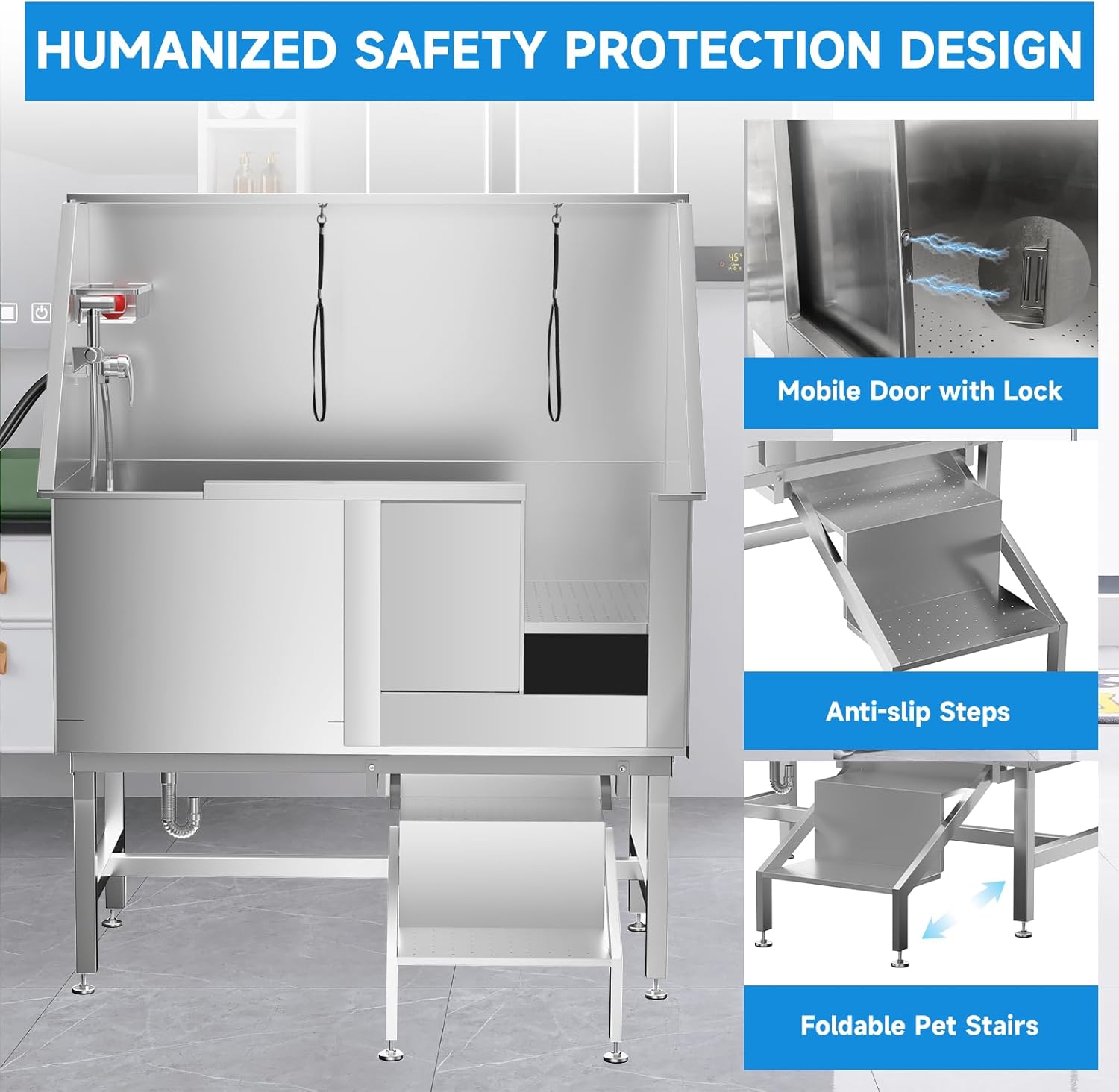 - 【HIGH-QUALITY MATERIALS】Our dog tubs for bathing are crafted with precision using durable 304 stainless steel. With an all-in-one design and leak-proof fully welded structure, our pet grooming & wash tub can prevent water leakage and odor backflow.