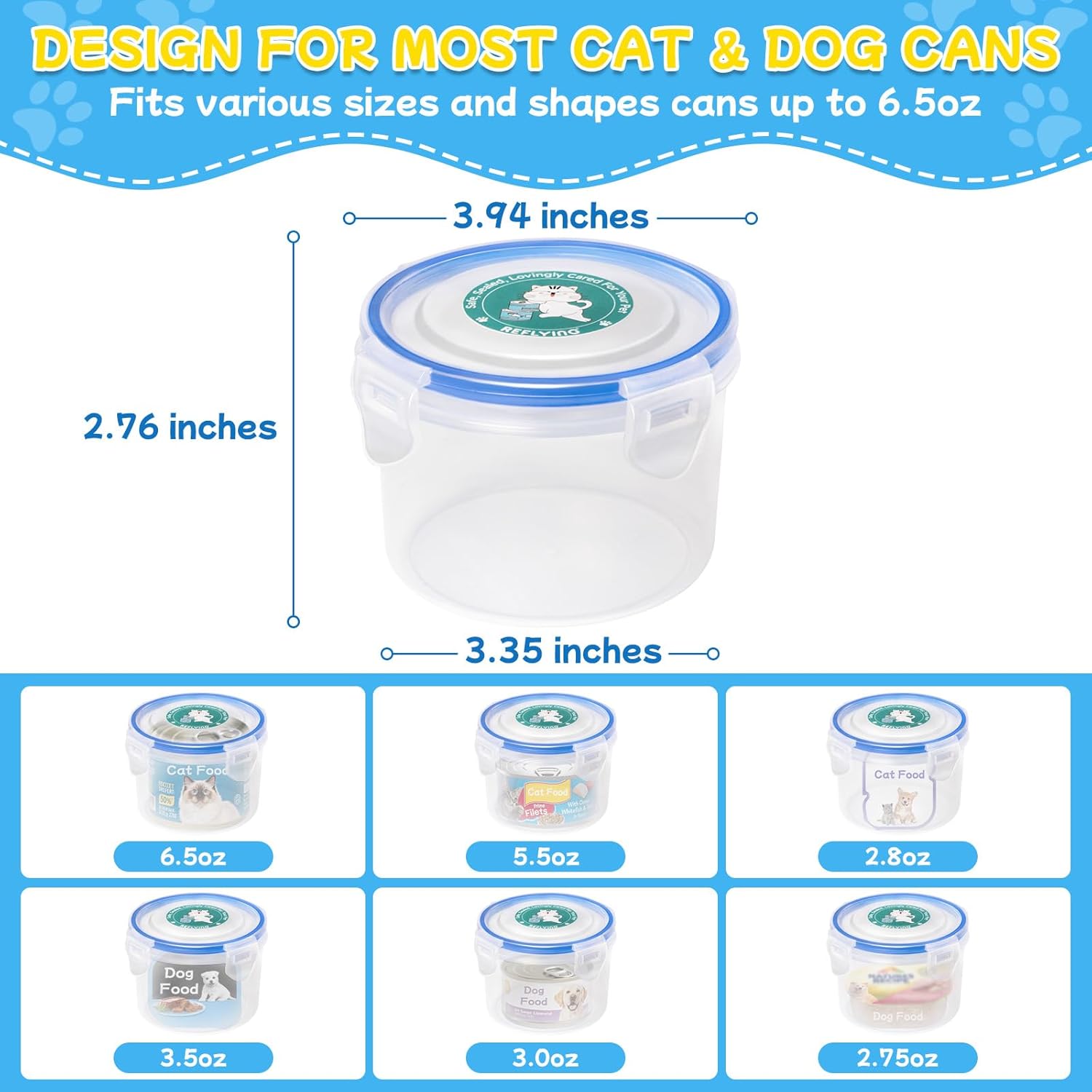 • FITS MOST 3 oz PET FOOD CANS: This versatile pet food storage container is designed to fit most standard-size cat & dog food cans. This air tight dog food storage container measures 3.35 x 2.76 inches, fits most standard up to 6.5 oz cat & puppy can food sizes. can directly store opened cans, or inverted cans for easy access,or store canned meat chunks directly and for homemade pet meals