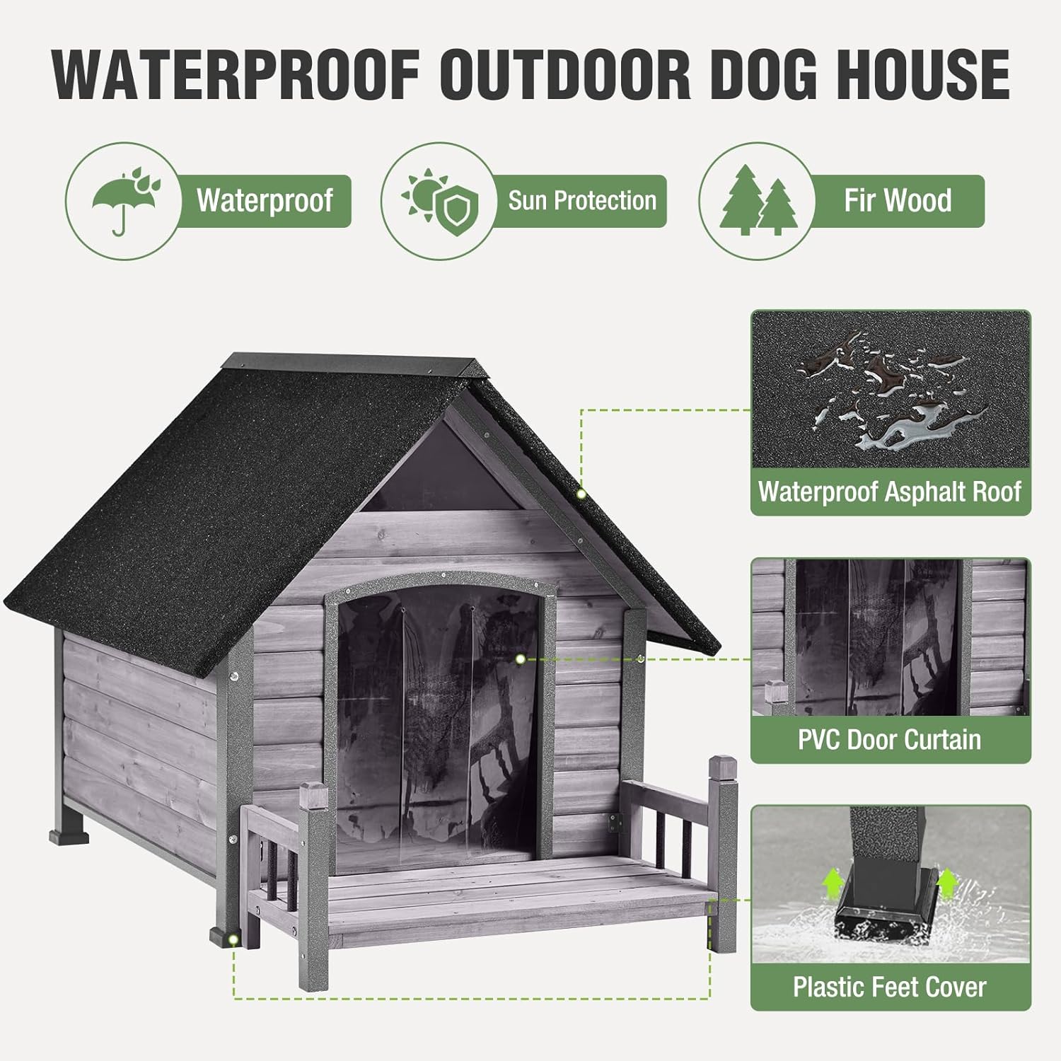 • Easy to Clean and Maintain: The dog house has a wooden floor at the bottom, which is easy to clean and maintain. The removable floor design facilitates daily cleaning, keeping the inside of the dog house tidy and clean. The transparent PVC door curtain not only keeps out wind and insects but also allows you to monitor your pet's condition at any time.