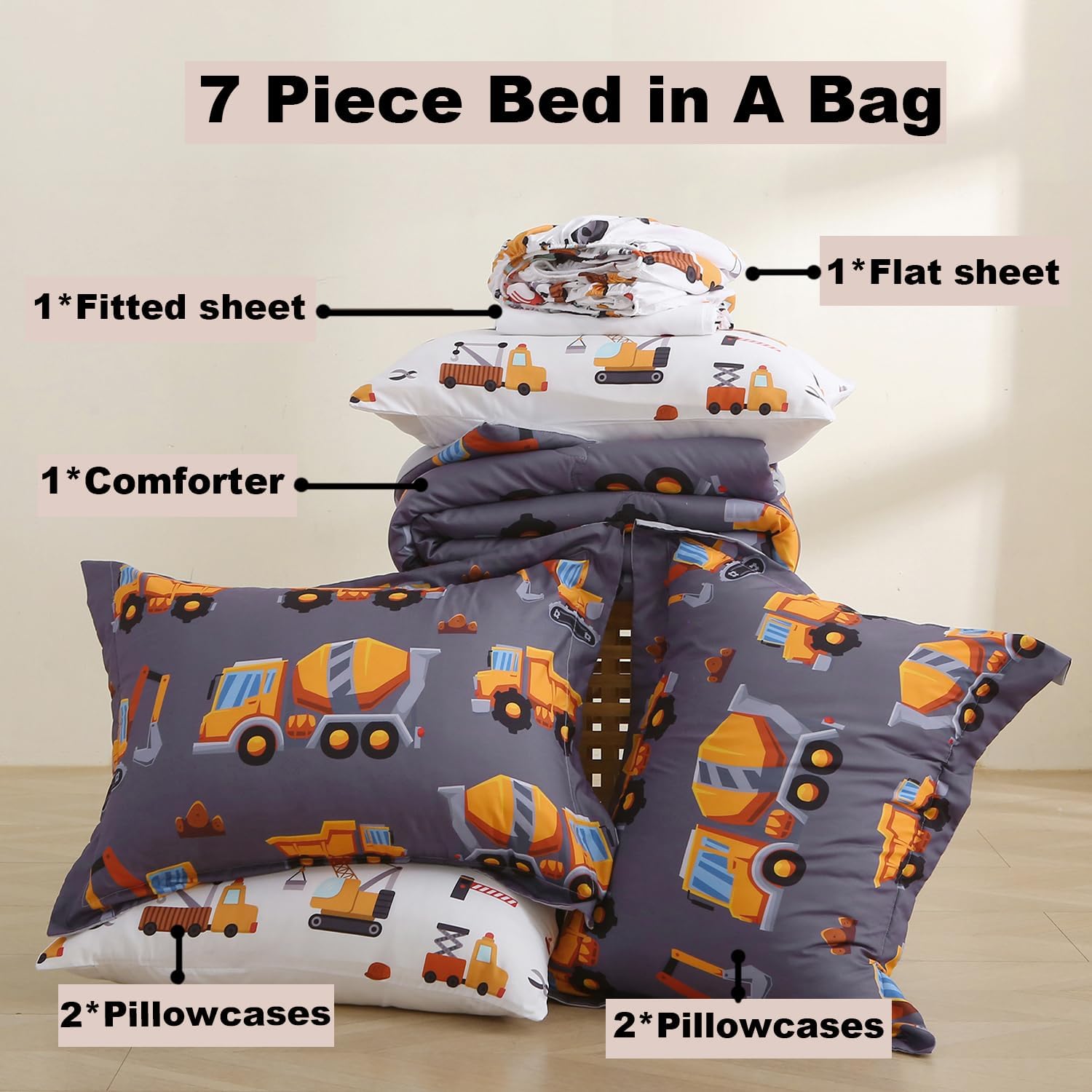 Kids Comforter Set 7 Piece Bedding Cute Car Cartoon Truck Bed Microfiber Comforter Full Size All Season Excavator Car Truck Printed