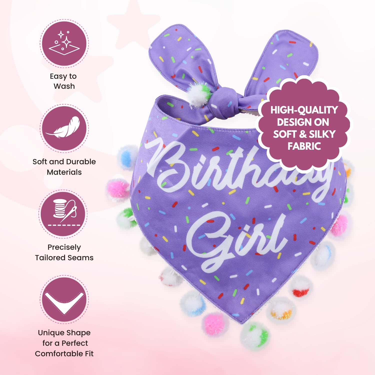 LunaMarie - Luxury Pet Birthday Bandanas -Premium & Silky Poly Fabric | 100% Handmade | Custom Shape Dual Layered (Birthday Girl Purple, Medium)