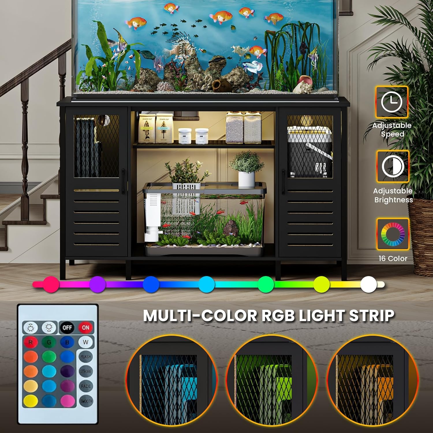 - 【Vibrant LED Strip Light】The aquarium stand features a built-in LED strip light with 16 colors and 4 dynamic modes. Using the included remote control, you can freely adjust the color and flashing frequency. Illuminating with soft light at night not only instantly enhances the visual appeal of your aquarium but also creates a sophisticated and dreamlike ambiance in your living room or study.